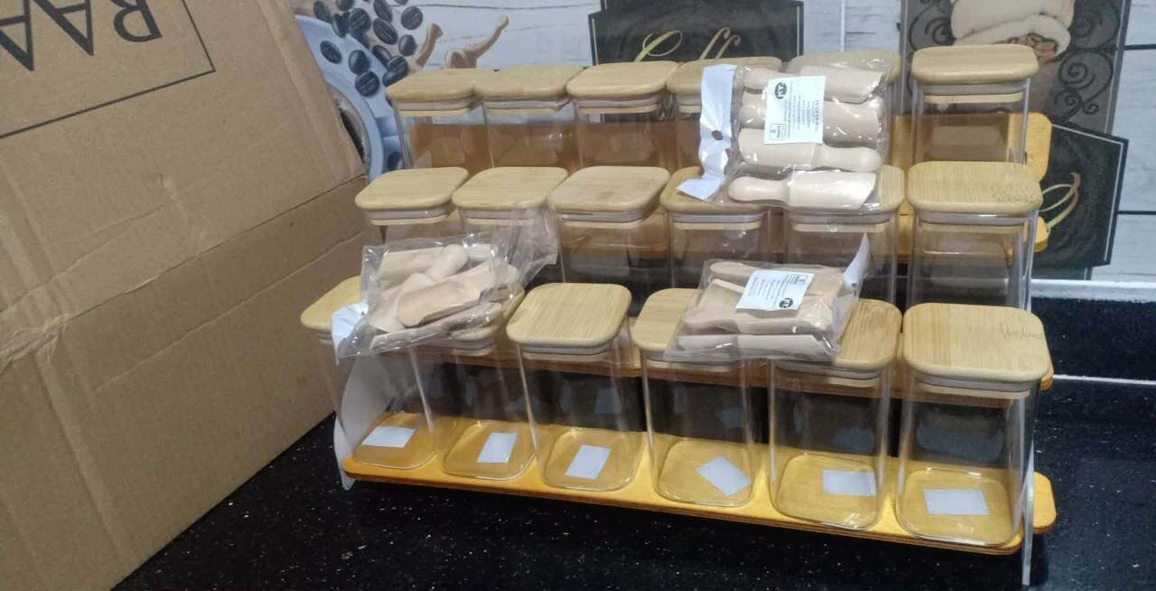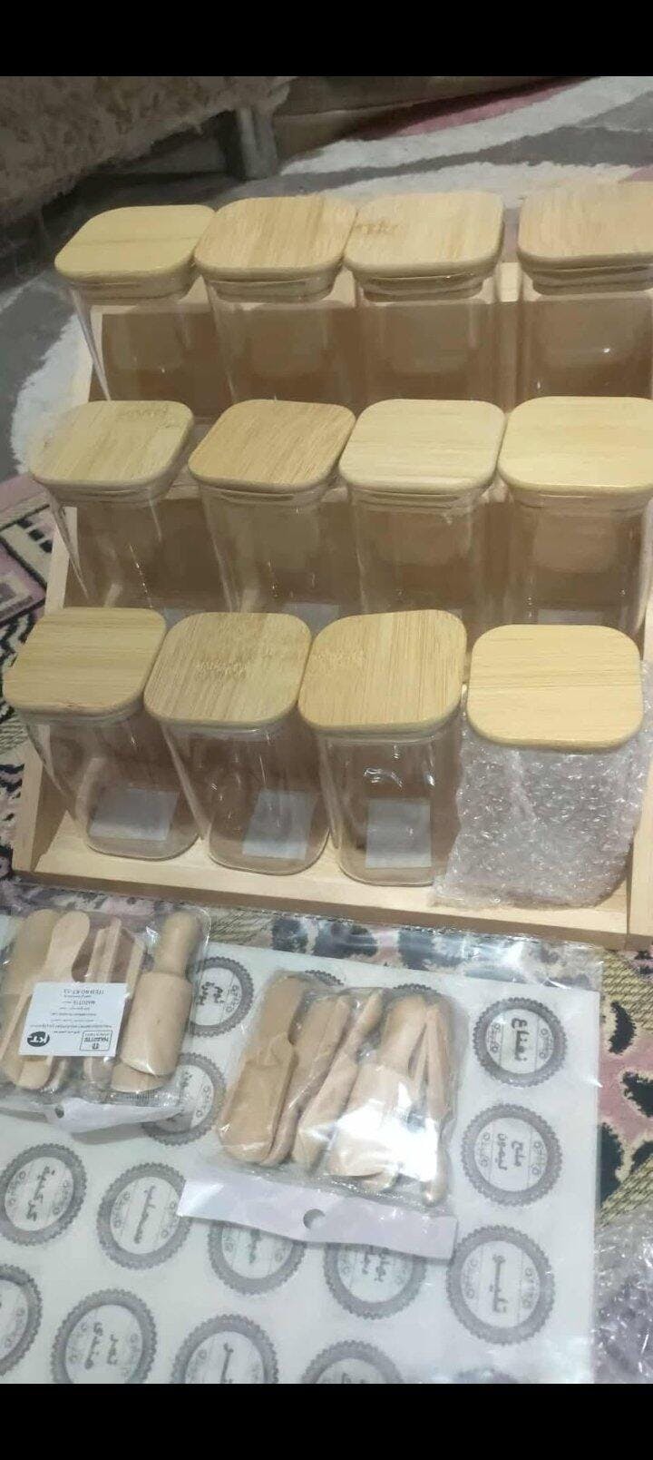 طقم بهارات خشب × أكريليك - 18 برطمان + 18 معلقة + استيكر هدية - شكل شيك وترتيب جاهز
