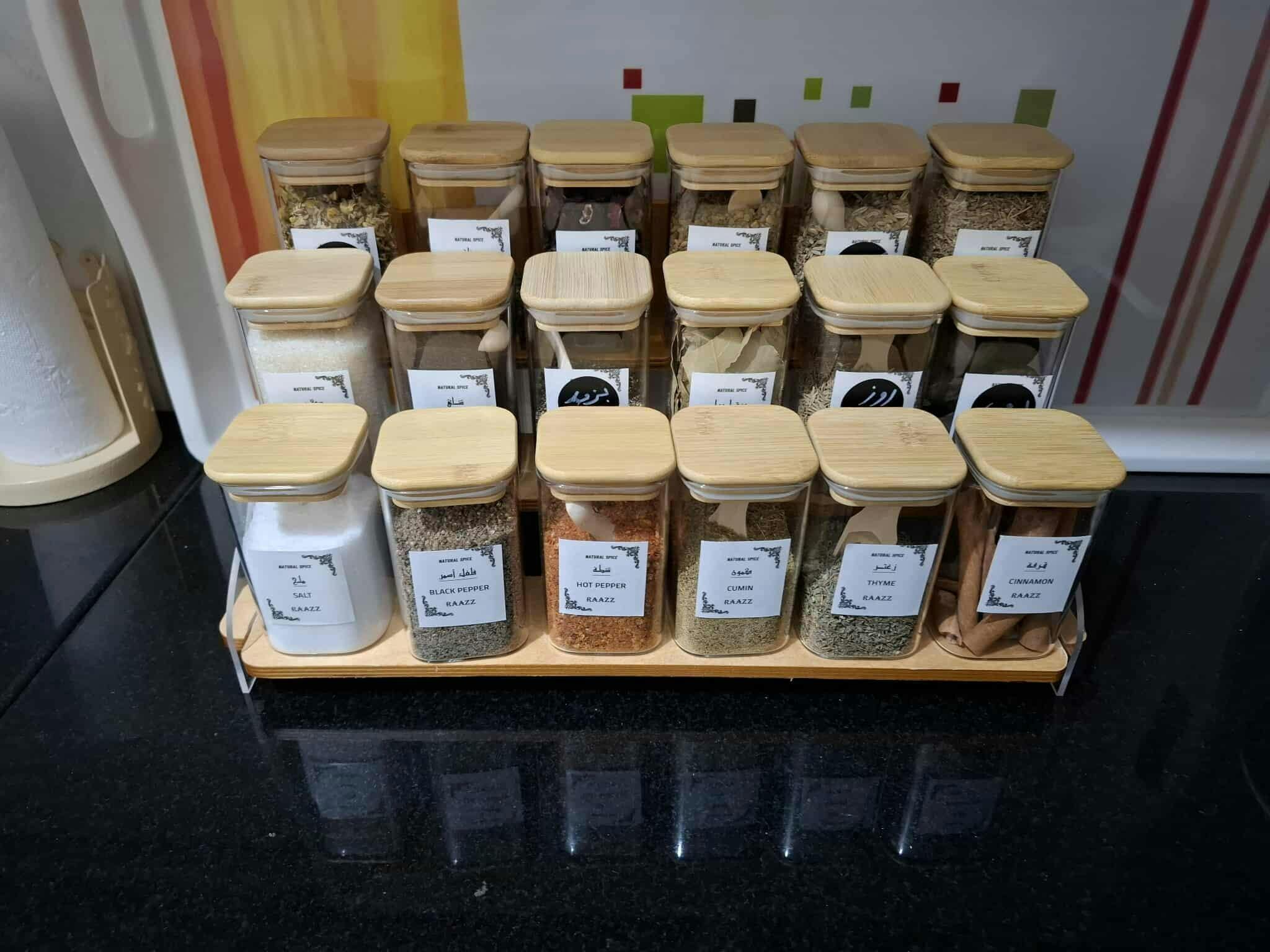 خلي مطبخك منظم وشيك مع منظم البهارات الخشب × الأكريليك بـ18 برطمان زجاج بغطاء محكم.